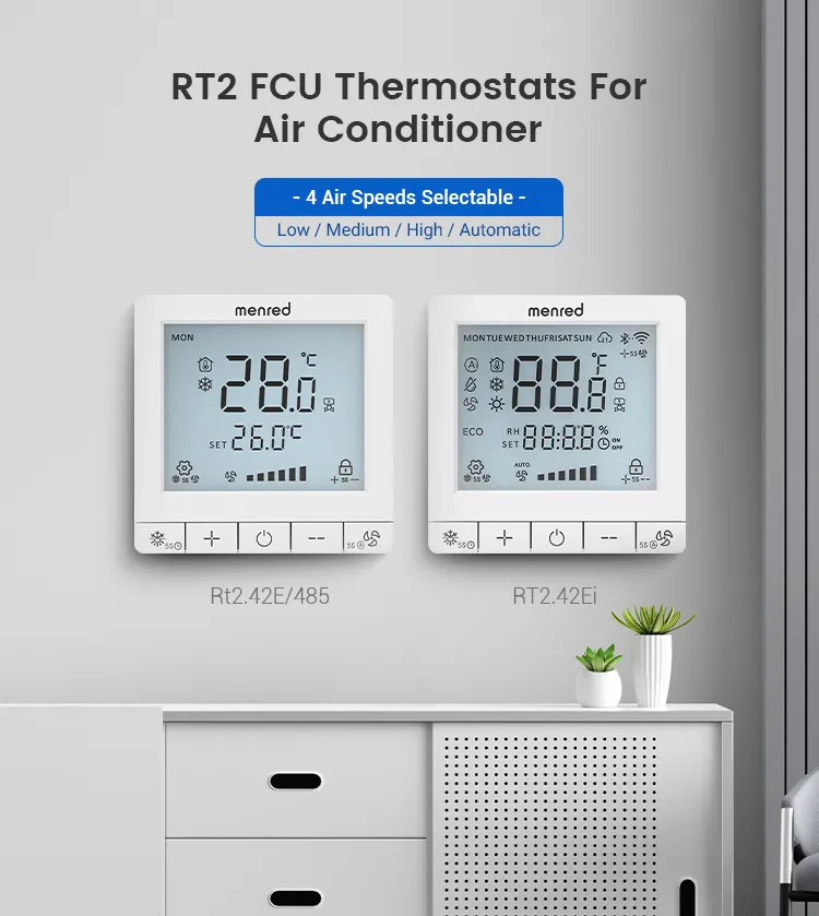 The MENRED RT2 FCU Thermostat, an innovative and advanced solution tailored for enhancing the performance and comfort of your 2-pipe Fan Coil Unit (FCU) system. This state-of-the-art thermostat represents the pinnacle of modern HVAC control, designed to deliver unparalleled efficiency and convenience for your indoor climate management. The RT2 FCU Thermostat is engineered with precision to effectively regulate both the fan speed and the on/off valve actuator within your central ai conditioning system.