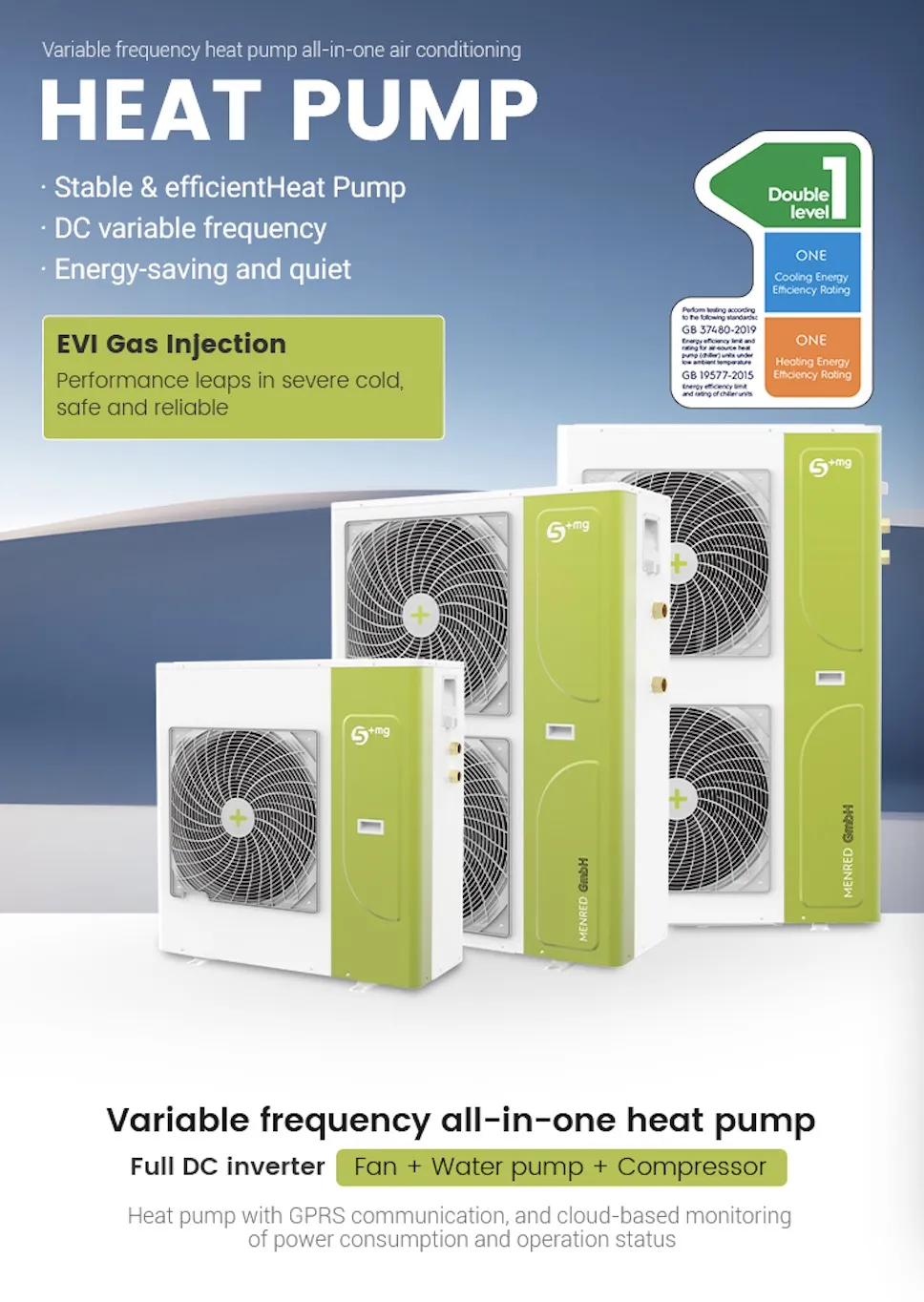 MENRED air source heat pump is characterized by its DC variable frequency operation, energy-saving and quiet performance, stability, efficiency, and the ability to deliver superior performance even in severe cold conditions through EVI gas injection technology. It is a safe and reliable solution for efficient temperature control in various environments.
